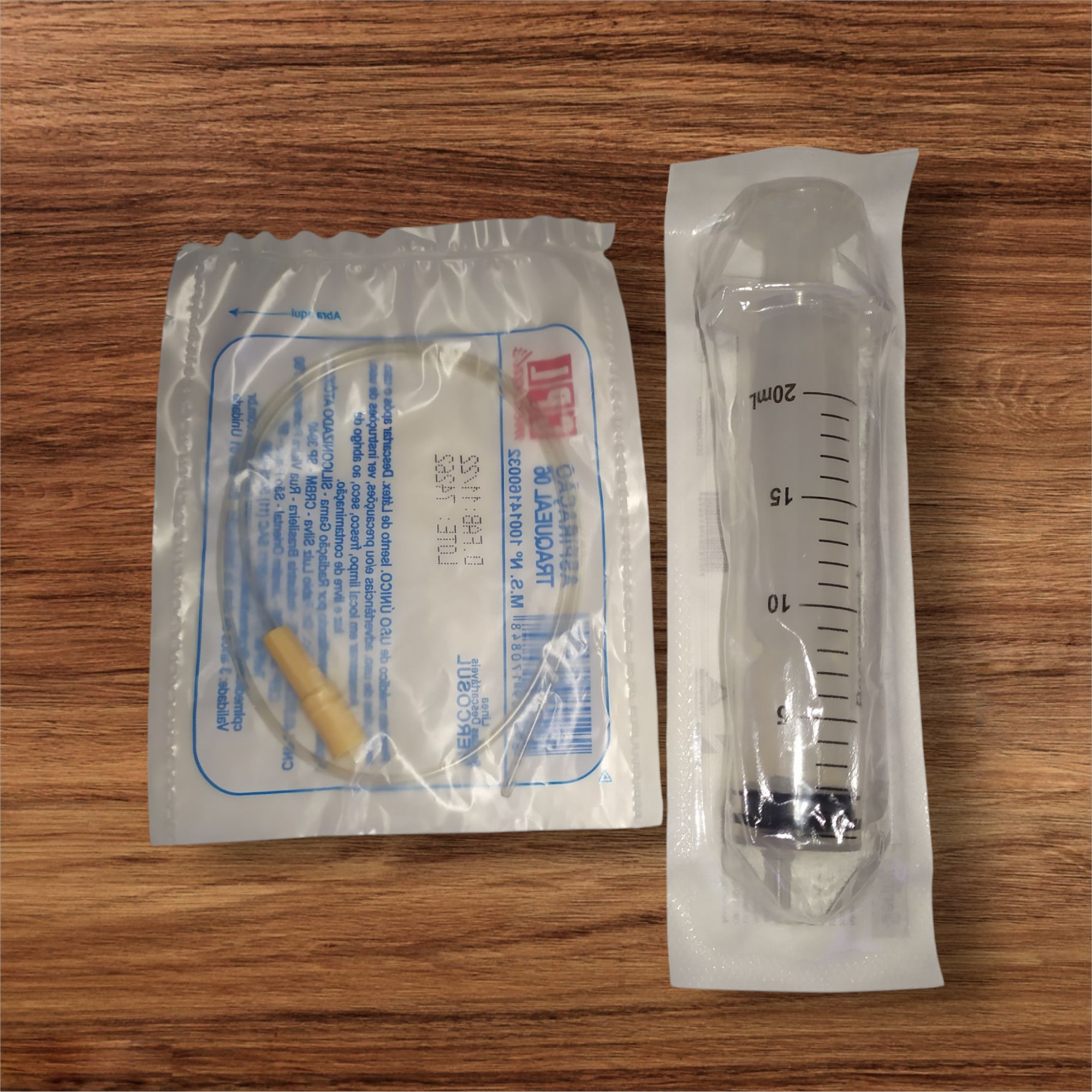 1 Seringa 20 ml sem agulha + 1 Sonda de Aspiração Traqueal n 06.